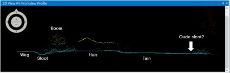 Door een dwarsprofiel te maken (afbeelding 10), ontdekt hij dat de oude sloot als minimale verdieping nog zichtbaar is. Met behulp van puntenwolken maakt Harald een 3D-model van het terrein, waarmee hij de contouren van de sloot uit 1944 kan reconstrueren.